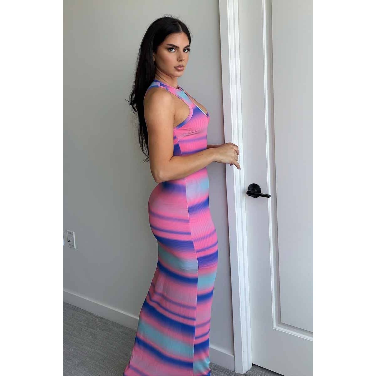 Chic crochet knit maxi dress featuring a flattering bodycon silhouette and a subtle back slit for ease of movement.