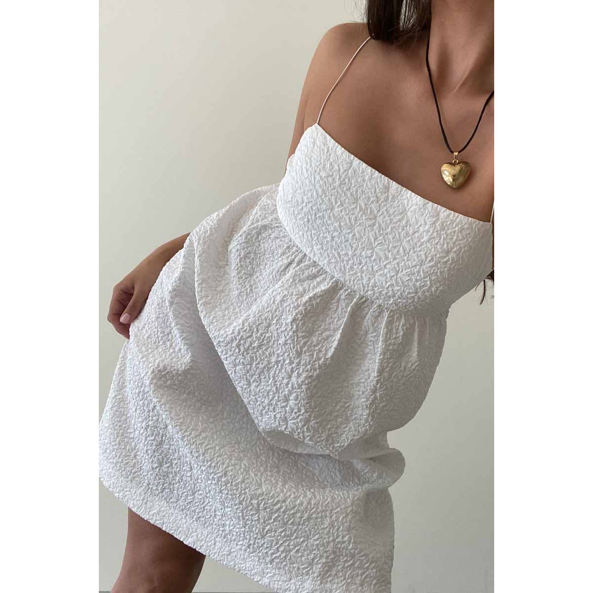 - Fitted bodice with a balloon-style mini skirt
