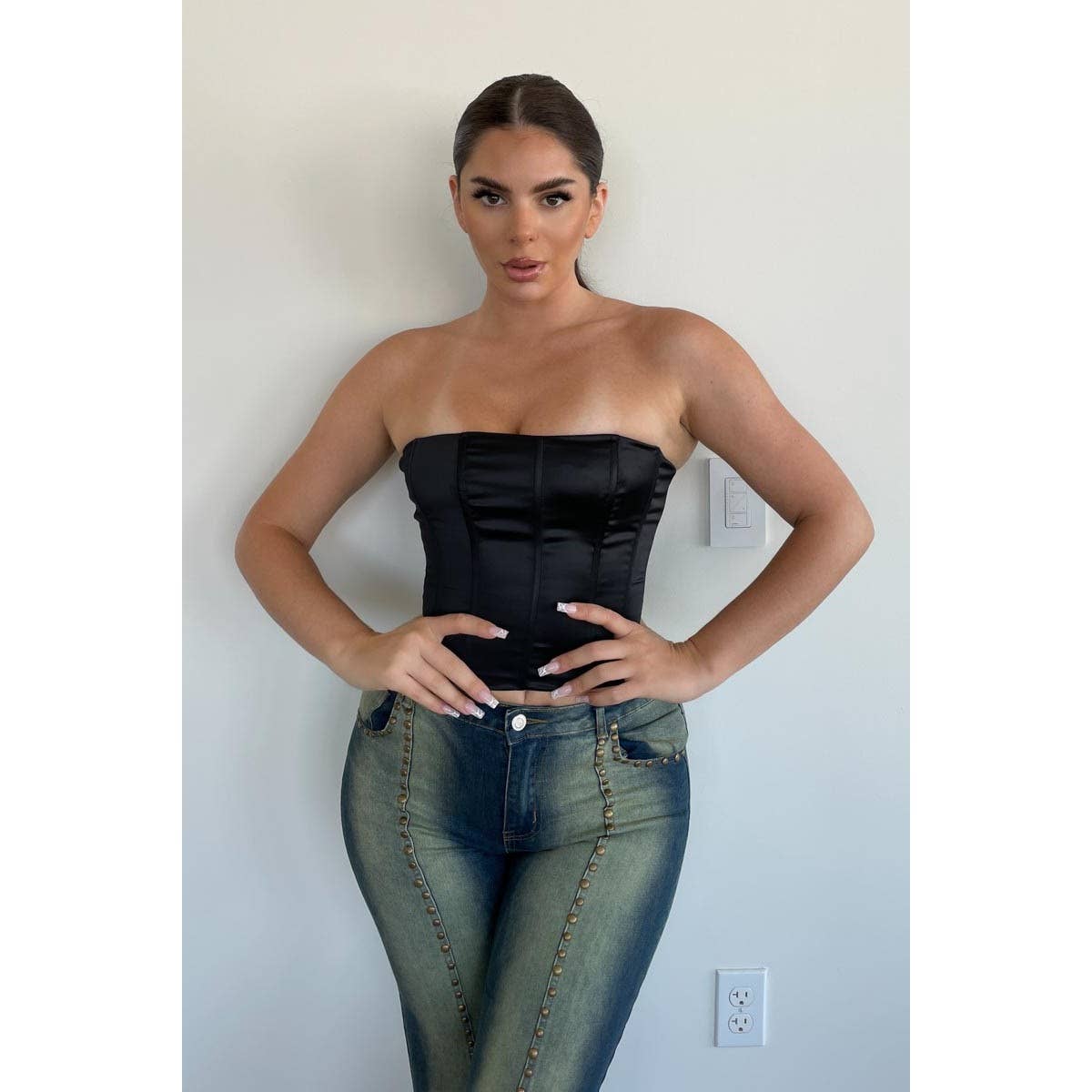 Precio unitario / porSleek satin corset with a lace-up back and strapless design.