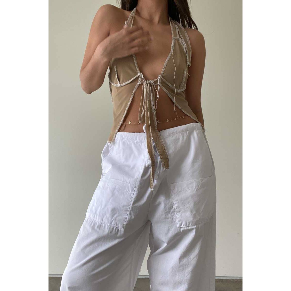 Trendy ruched crop top with unique front detailing.