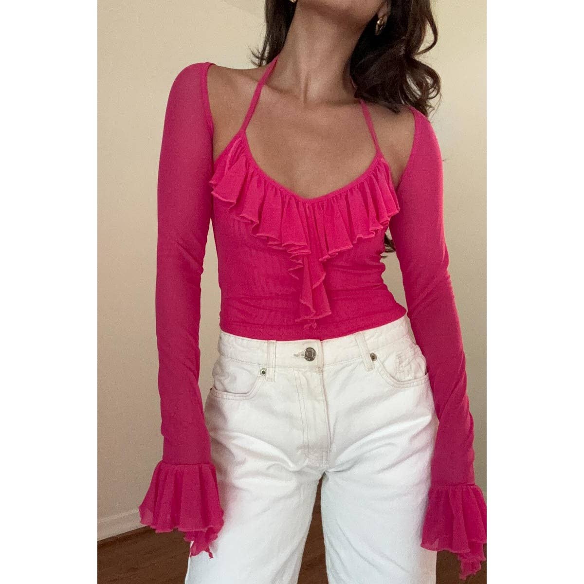 Precio unitario / porRuffle Trim Long Sleeve Crop Top with vibrant chic style.