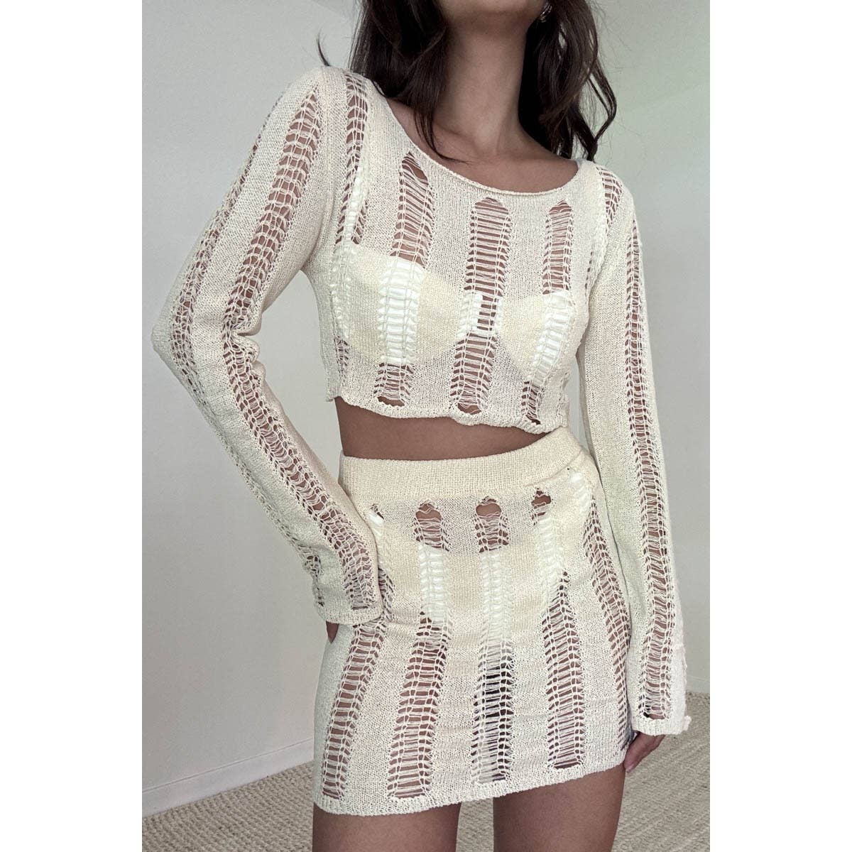 Chic mesh crop top paired with a stylish slit mini skirt.